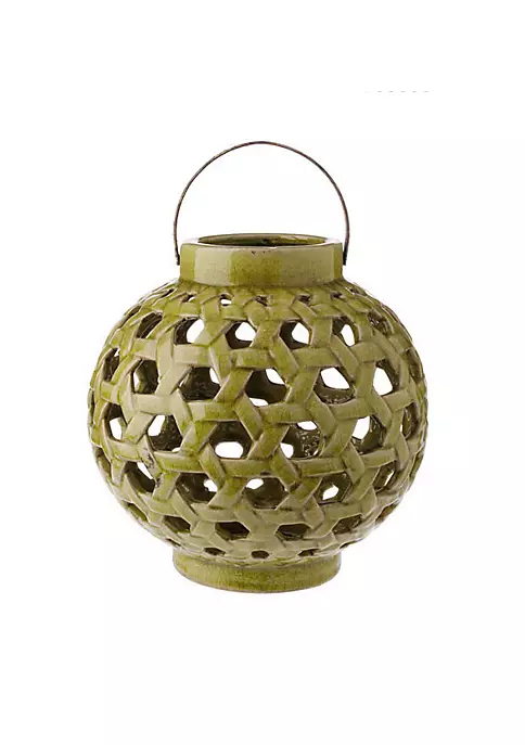 Decorative lantern features honeycomb cut out pattern and a crackled finish with a rustic weathered handle