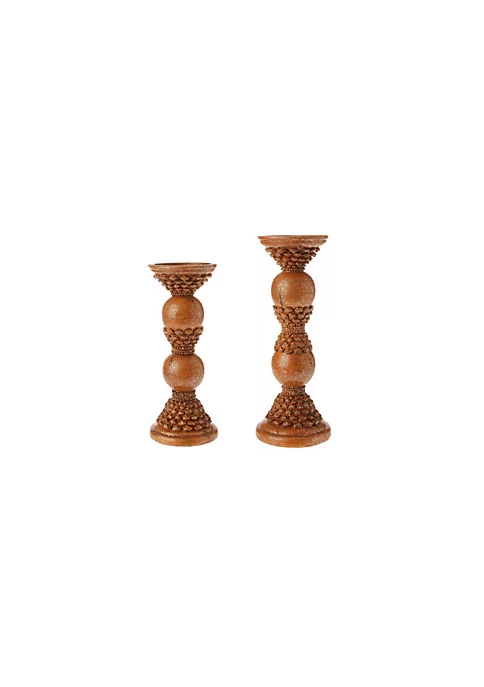 These candle holders featuring faux pine cone accents and embellished with glitter make the perfect accent for your autumnal decor