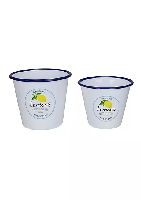 Set of two crisp white buckets have a vibrant yellow lemon design with contrasting navy blue rim. The front of each bucket provides some of the many ways to use lemons such as for flavoring sweet and savory dishes using in baked goods or as a garnish. The buckets are non-food safe and should be used for decorative purposes only. Perfect for adding a pop of color to your kitchen counter top.